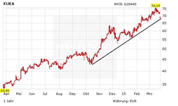 Trotz des Rücksetzers ist der Aufwärtstrend bei KUKA weiterhin gültig. Sobald Swisslog vollständig integriert ist, dürfte auch das operative Geschäft wieder anziehen. DER AKTIONÄR bleibt positiv für die MDAX-Aktie gestimmt. Anleger lassen die Gewinne laufen. Schnäppchen-Jäger versuchen zwischen 64 und 65 Euro zum Zug zu kommen. Ein Stopp bei 62 Euro sichert ab.