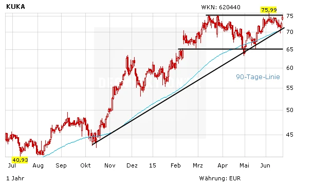 DER AKTIONÄR rät investierten Anlegern weiter dabeizubleiben. Mit dem Sprung über das Jahreshoch von 75,99 Euro würde zudem ein frisches Kaufsignal generiert werden. Auch fundamental ist das Papier aufgrund der Wachstumsperspektiven nicht teuer: Denn 2016 dürfte das KGV dann von aktuell 30 auf 21 sinken. Den Stopp sollten Anleger bei 62,00 Euro belassen.
