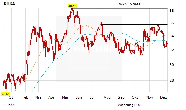 Mit den guten Nachrichten im Gepäck startet die Aktie einen weiteren Versuch, die Widerstände bei rund 36 und 38,50 Euro nachhaltig zu überwinden. Zuletzt hatten Spekulationen über eine Übernahme des deutschen Industrieroboter-Herstellers durch den Schweizer Elektrotechnikkonzern ABB den Kurs beflügelt. Im schwächeren Marktumfeld sind die Gerüchte aber verpufft und der Kurs ist wieder zurückgefallen.