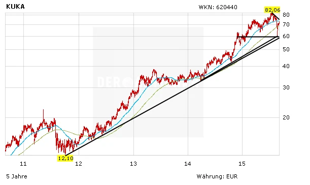 KUKA baut automatisierte Produktionsanlagen und Roboter vor allem für die Automobilindustrie. Bei Industrierobotern für die Autobranche zählt sich der Konzern zu den drei weitgrößten Firmen und bezeichnet sich als Marktführer in Europa. Das Unternehmen mit Sitz in Augsburg verringert die Abhängigkeit von der Autobranche und erschließt erfolgreich neue Abnehmer-Industrien, wie etwa die Medizintechnik oder die Luft- und Raumfahrtindustrie. Zudem stieg jüngst die Nachfrage im wichtigen nordamerikanischen Markt.