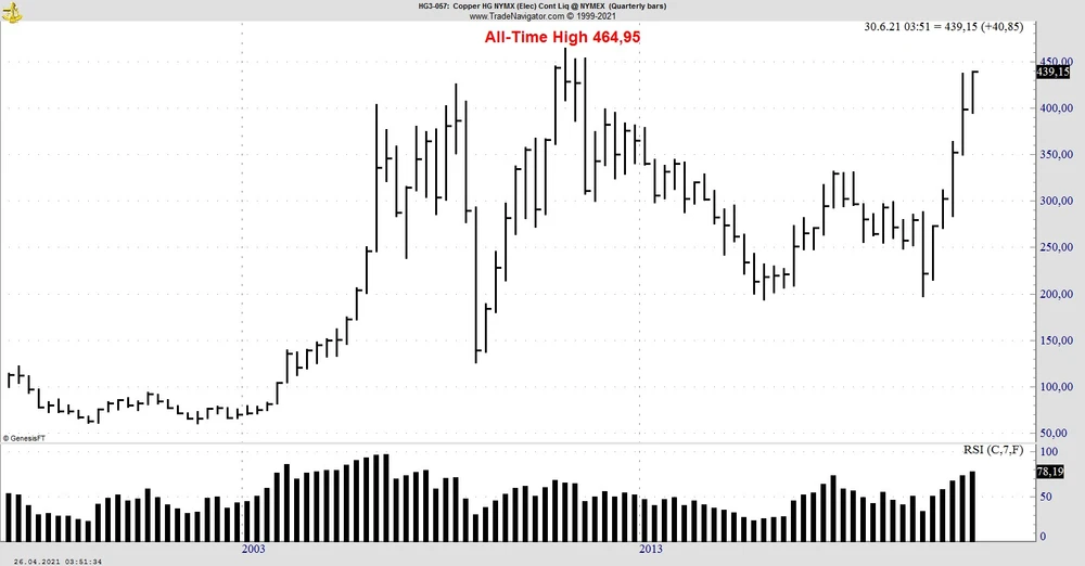 Der Kupfer Future, der an der amerikanischen CME Terminbörse gehandelt wird, konnte heute Morgen die Höchststände von Ende Februar bei 437,55 US-Cent überwinden und testete die 440 US-Cent Marke, was ein neues 10 Jahreshoch bedeutet.
