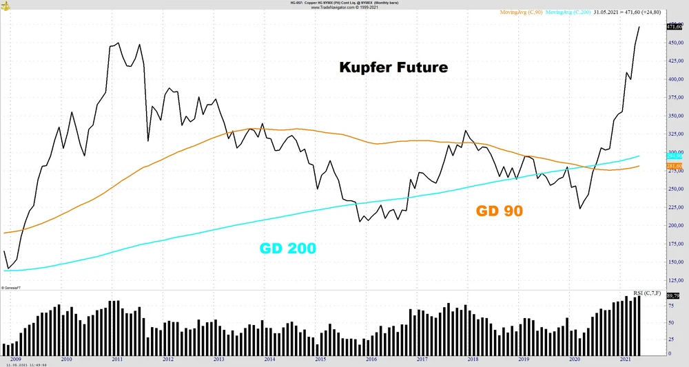 Der Preis von Kupfer kennt aktuell kein Halten. Nach dem Rekordhoch zu Beginn der neuen Handelswoche bei 488,80 Cent setzten erst einmal Verkäufe ein und der Future fiel im Intra-Day-Handel auf 466,75 Cent. Fundamental hat sich an dem bullishen Szenario nichts geändert. Die hohen Kurse sorgen, wie in vielen anderen Rohstoff Märkten auch, für eine erhöhte Volatilität.
