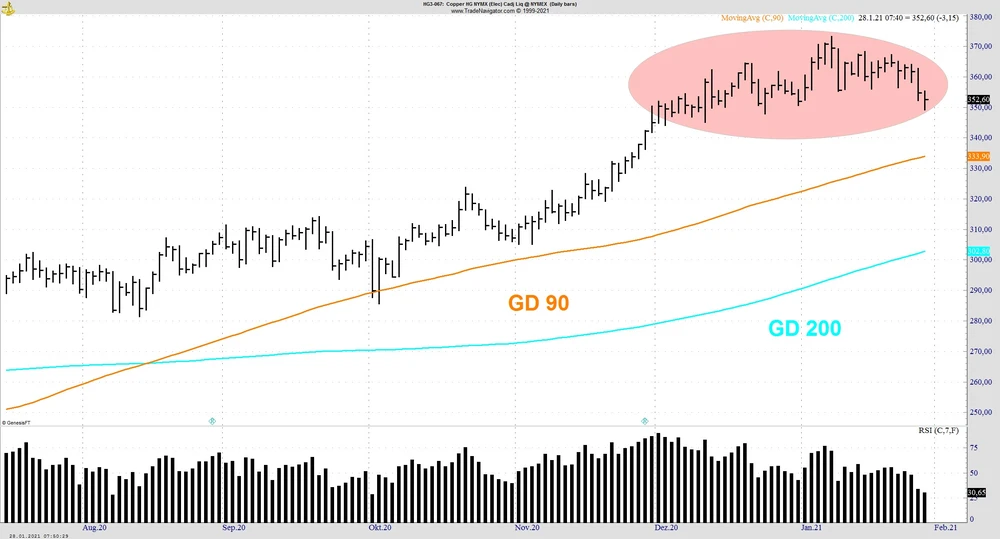 Kupfer verliert weiter an Fahrt und handelte heute erstmals seit Dezember 2020 unter 350 US-Cent und damit auch unterhalb der Unterstützung bei 355,50 Cent. Die Erwartung des Marktes, dass die Volksrepublik China sich bei Kupfereinkäufen aktuell zurückhält schein weitgehend eingepreist zu sein.