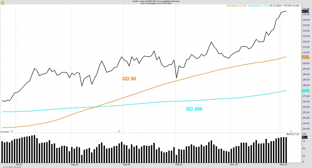 Der fulminante Anstieg von Kupfer geht ungebrochen weiter, seit Anfang November ist das Industriemetall um weitere 15 Prozent gestiegen, seit den Tiefstständen im März sogar um mehr als 70 Prozent.
