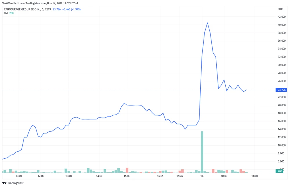 Bei 19,50 Euro beendete Cantourage am Freitag seinen ersten Handelstag (DER AKTIONÄR berichtete) – eine Verdreifachung gegenüber dem ersten Kurs von 6,48 Euro. Auch am Montag kennt die Aktie kein Halten. Nachdem sie auf dem Handelssystem Xetra in der Spitze am Vormittag bis auf 40,49 Euro kletterte, ist sie im Anschluss deutlich zurückgekommen. Aktuell notieren die Papiere bei 24,99 Euro rund 53 Prozent im Plus.