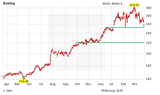 Ob Boeing ein ähnlich erfolgreiches Jahr wie 2017 schafft, bleibt abzuwarten. Die Wachstumsprognosen für Passagierzahlen und die bis weit ins nächste Jahrzehnt gefüllten Auftragsbücher bilden eine hervorragende Grundlage für eine Fortsetzung der Erfolgsgeschichte. Anleger sollten sich vom gestrigen Rücksetzer keinesfalls beunruhigen lassen. Neueinsteiger können die aktuell niedrigen Kurse als Kaufchance wahrnehmen. Das Kursziel des AKTIONÄR liegt bei 355 Euro. Investierte Anleger beachten zudem den Stopp-Kurs bei 220 Euro.