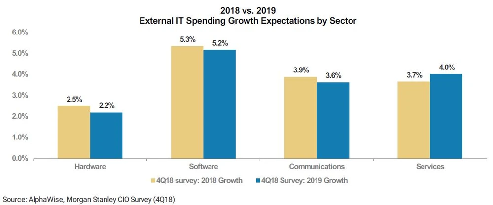 Dieser Trend dürfte den gesamten Konzern auch 2019 antreiben – Analysten rechnen im laufenden Geschäftsjahr mit einem Umsatzanstieg von 13 Prozent auf 125 Milliarden Dollar. Unterstützt wird diese Konsensschätzung von einer Umfrage von Morgan Stanley unter CIOs, laut der die IT-Ausgaben stabil bleiben und Umsatzwachstum sowie Margen der Software-Konzerne nur minimal abnehmen dürften.