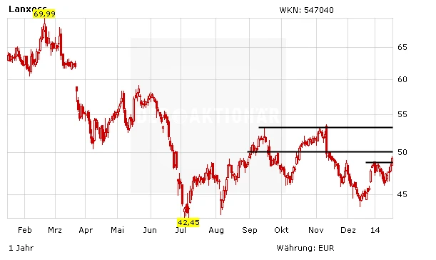Die Lanxess-Aktie zählt am Freitag zu den gefragtesten Werten im DAX. Durch das Kursplus kletterte die Chemieaktie über den horizontalen Widerstand bei 48,87 Euro und löste damit ein Kaufsignal aus. Gelingt nun noch der Sprung über die 50-Euro-Marke, wäre aus charttechnischer Sicht Luft bis in den Bereich von 53,00 Euro.