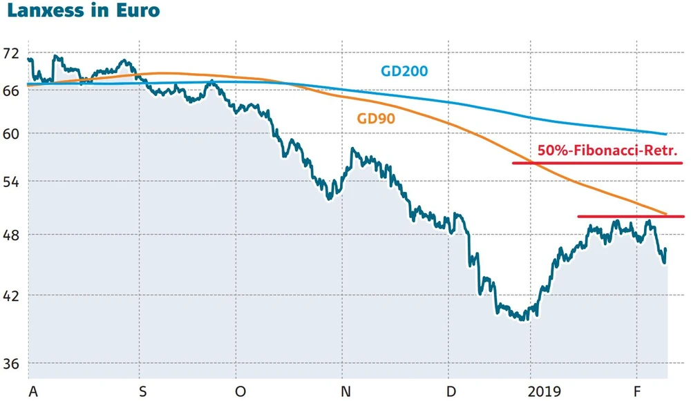 Lanxess dürfte das Schlimmste hinter sich haben und die Aktie wieder Boden gut machen können. Das erste Ziel lautet 50 Euro, im Anschluss könnte die Aktie an das 50%-Fibonacci-Retracement der Abwärtsbewegung zwischen September und Dezember bei etwa 56 Euro heranlaufen. Für dieses Szenario bietet sich ein Faktor-Zertifikat an, dass in der Sendung "Trading-Tipp des Tages" vorgestellt wird.