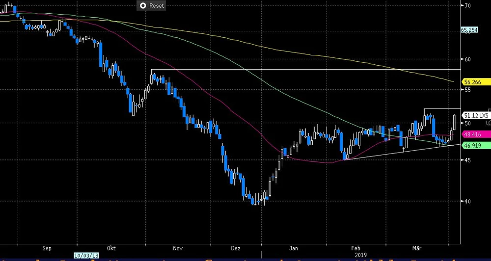 Wenig verwunderlich angesichts des stattlichen Kursziels, das Deutsche-Bank-Analyst Tim Jones ausgegeben hat: Seiner Ansicht nach liegt der faire Wert der Lanxess-Aktie bei 70,00 Euro, was rund 40 Prozent Aufwärtspotenzial entspricht. Rein charttechnisch betrachtet wird es bei Lanxess nun wieder spannend: Gelingt der Sprung über die Marke von 52,00 Euro, wäre anschließend der Weg nach oben bis zum Widerstand bei 58,30 Euro frei.
