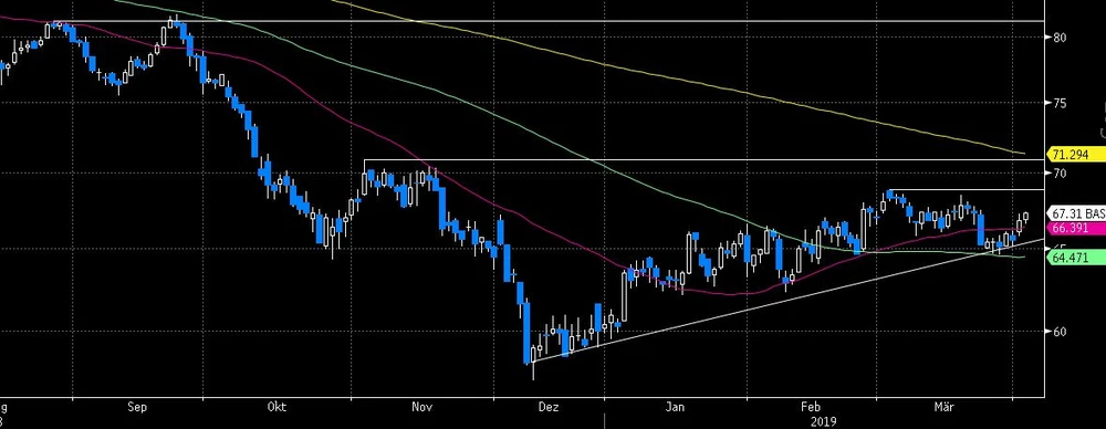 Etwas weniger dynamisch kommt die Aktie von Branchenprimus BASF voran. Der DAX-Titel hängt immer noch unter dem Jahreshoch bei 68,07 Euro fest. Sollte dieser Widerstand genommen werden, liegt bei 70,91 Euro die nächste Hürde. Wird auch diese Hürde aus dem Weg geräumt, hätte der Kurs anschließend Luft bis in den Bereich um 81 Euro.