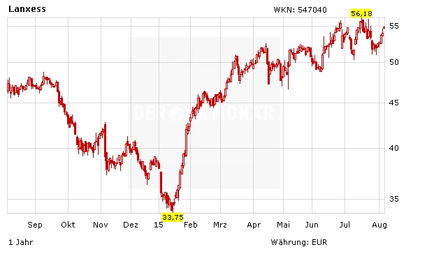 Nach der Bekanntgabe der Eckdaten Ende Juli war die Lanxess-Aktie auf ein 52-Wochen-Hoch geklettert, einen Teil der Gewinne musste die anschließend aber wieder abgeben. Nach den endgültigen Zahlen und der Prognose-Erhöhung nimmt der Titel das Zwischenhoch nun wieder ins Visier und gehört am Donnerstagvormittag zu den Topgewinnern im DAX.