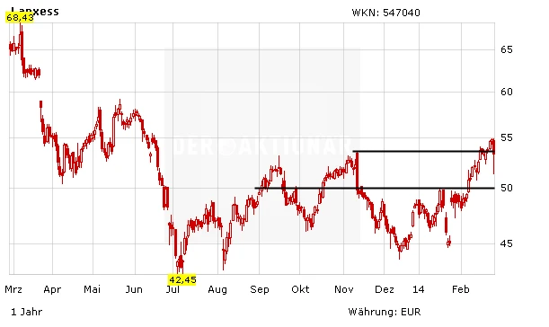 Die Experten der National-Bank stufen den DAX-Titel trotz der schlechten Neuigkeiten weiterhin mit „Kaufen“ ein. Den fairen Wert von Lanxess sehen sie weiterhin bei 60 Euro. Analyst Ekkehard Link geht davon aus, dass die außerplanmäßige Abschreibung die Erholung des Spezialchemiekonzerns zwar möglicherweise verlangsamen, aber nicht stoppen dürfte. Auch die NordLB stuft Lanxess weiterhin mit „Kaufen“ und einem Kursziel von 58 Euro ein. Thorsten Strauß sieht die schlechte Neuigkeit von der positiven Seite. Der künftige Vorstandsvorsitzender Matthias Zachert kann im Mai seiner Meinung nach somit ein Unternehmen frei von Altlasten übernehmen.