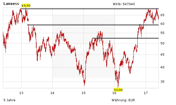 Denn die MDAX-Titel notieren durch den heutigen Kurssprung nur nicht mehr weit unter dem Hoch bei 69,12 Euro, das Allzeithoch liegt bei 69,99 Euro. Sollte dank des Buffett-Rückenwinds diese Marken übersprungen werden, wäre der Weg nach oben vorerst frei. Anleger können jetzt bei Lanxess zugreifen (Stopp: 52,00 Euro).