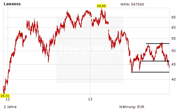 Aus charttechnischen Gesichtspunkten hat sich die Situation in den vergangenen Tagen weiter eingetrübt. Nachdem sich an der 53-Euro-Marke ein Doppeltop ausbildete, ist die Lanxess-Aktie im Zuge der Abwärtsbewegung bereits unter die Unterstützung bei 46,15 Euro gefallen. Nun rückt das alte Jahrestief bei 42,41 Euro in den Fokus. Fällt der Titel auch noch unter diese Marke, drohen weitere Kursverluste. Die nächste Unterstützung wartet erst am Vorjahrestief bei 35,28 Euro.
