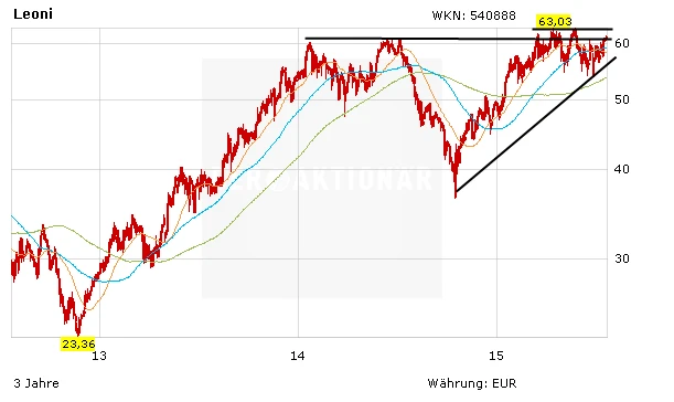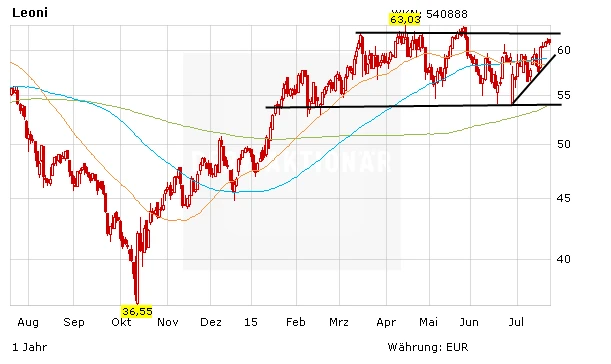 Die Leoni-Aktie hält sich noch in der Bandbreite zwischen 54,50 und 63,03 Euro. Bricht die Aktie über das alte Hoch bei 63,03 Euro aus, sollte das Papier durchstarten. Kursziel: 75 Euro.