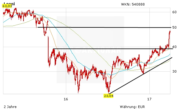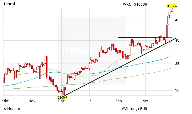 Von knapp 40 Euro ging es bis auf 48 Euro nach oben. Hauck & Aufhäuser sieht die Aktie bei 54 Euro fair bewertet. Warburg Research legt noch eine Schippe drauf und hob das Kursziel von 47 auf 55 Euro an. Der Autozulieferer sei auf einem guten Weg zu steigenden Umsätzen und Margen, schrieb Analyst Marc-Rene Tonn in einer Studie.