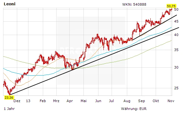 ¿Nach den guten operativen Vorgaben im zweiten Quartal und einem sich leicht aufhellenden Bild für den europäischen Auto- und Truckmarkt erhöhen wir unsere Schätzungen für die Leoni AG für 2014/15¿, sagt Analyst Christian Ludwig vom Bankhaus Lampe Ludwig. Sein Kursziel lautet 62 Euro. Vom aktuellen Niveau aus würde das für die Leoni-Aktie noch ein Potenzial von rund 24 Prozent bedeutet.