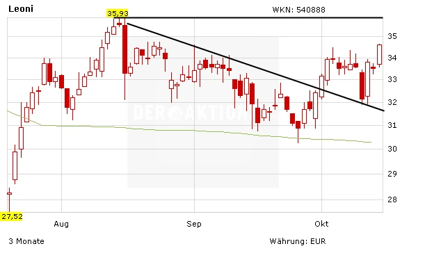DER AKTIONÄR hat bereits berichtet: Was die Kennzahlen betrifft, so ist Leoni eine spannende, wenn auch spekulative Wette. Die nächsten belastbaren Zahlen gibt es am 16. November. Aus charttechnischer Sicht hellt sich das Bild schon jetzt mehr und mehr auf. Vor wenigen Tagen hat die Aktie den kurzfristigen Abwärtstrend verlassen und nimmt nach einem kurzen Test der ehemaligen Widerstandslinie nun wieder Kurs auf den nächsten Widerstand bei 36 Euro.