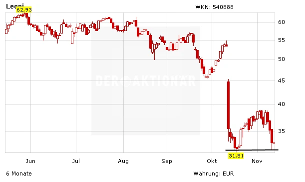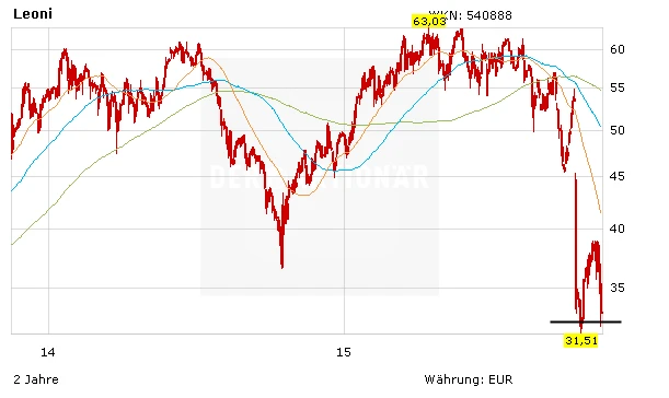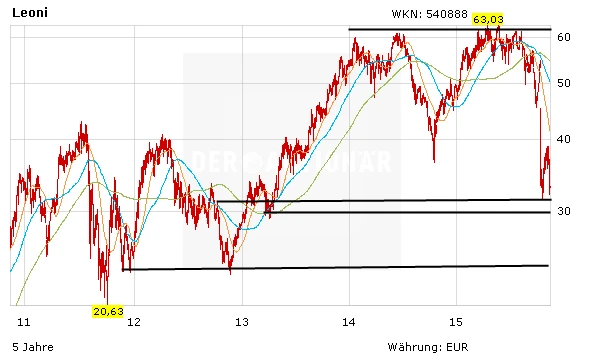 Am Mittwoch ließ Leoni die Katze aus dem Sack. Statt der erwarteten 200 Millionen Euro EBIT werden es für 2015 wohl nur knapp über 130 Millionen Euro werden. Im Anschluss ging die Aktie erneut auf Tauchstation. Die Erholung im Anschluss an den ersten Einbruch von 32,50 Euro bis auf 38,50 Euro war dahin.