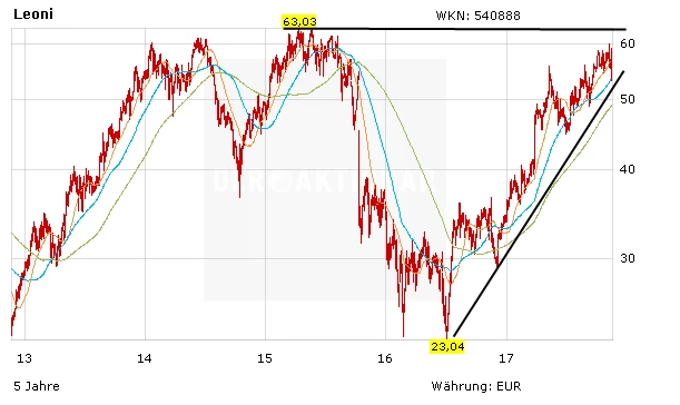 Was für eine Achterbahnfahrt. Nachdem Leoni am Donnertagmorgen seine Prognose für das Gesamtjahr erhöht hatte, ging es mit der Aktie zuerst um über zwei Prozent auf 59,15 Euro nach oben. Im Anschluss kam das Papier dann deutlich unter Druck und notierte im Tagestief bei 53,16 Euro. Eine Schwankung von fast zehn Prozent innerhalb von nur wenigen Stunden, das macht es für den Anleger derzeit nicht unbedingt leicht.