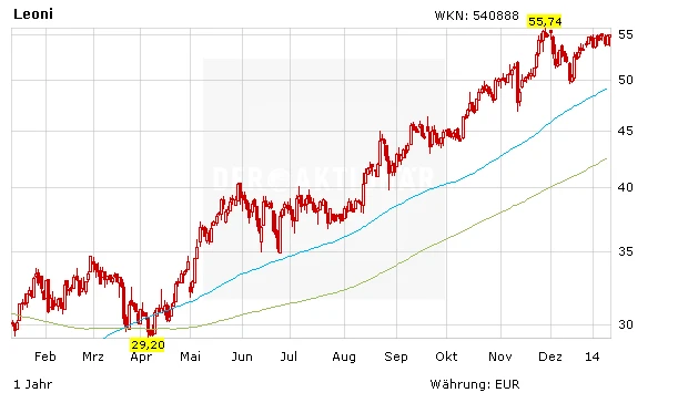 Deutlich optimistischer zeigen sich dagegen die Experten der britischen Investmentbank HSBC. Sie haben das Kursziel für Leoni von 60 auf 65 Euro angehoben und die Einstufung auf „Overweight“ belassen. Die Zielerhöhung reflektiere die stark gestiegene Sektorbewertung, so Analyst Niels Fehre. Seine unveränderten Gewinnerwartungen für den Automobilzulieferer lägen weiter über den Marktschätzungen. Zusätzliches Kurspotenzial könnte durch eine Erholung des Geschäfts mit der Industrie sowie bei möglichen Verkäufen von Teilen der Sparte Wire & Cable Solutions entstehen. Leoni ist einer der deutschen „Top Picks“ der HSBC für das erste Halbjahr 2014.