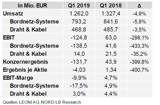 Leoni kämpft mit der schwachen Autoindustrie, aber auch mit hausgemachten Problemen. Der Produktionsbeginn eines Werkes im mexikanischen Merida funktionierte nicht richtig und konnte die Auftragslage lange nicht bewältigen, was zu hohen Sonderkosten für Personal und Frachten führte. Am Ende stand nach Einmaleffekten unterm Strich ein Verlust von 132 Millionen Euro zu Buche, nach einem Plus von 44 Millionen Euro im Vorjahreszeitraum. Der Quartalsumsatz sank wegen der schwachen Lage bei den Kunden aus der Autoindustrie um fünf Prozent auf 1,26 Milliarden Euro.
