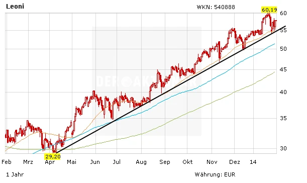 DER AKTIONÄR hält an seinem Fazit fest: Investierte Anleger geben kein Stück aus der Hand. Nächster Halt ist bei 62 Euro. Schwache Tage bieten bei Leoni immer wieder gute Einstiegsgelegenheiten.