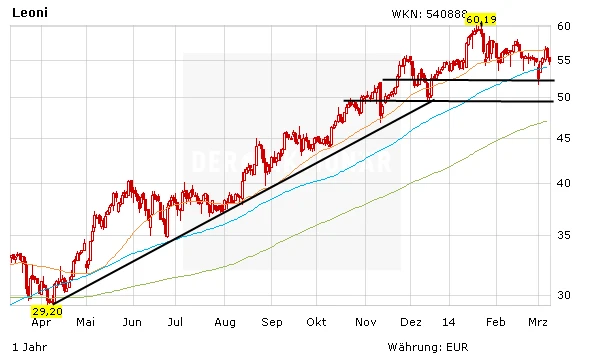 Nach dem kurzen Abtauchen bis auf 52,50 Euro drehte die Leoni-Aktie wieder auf. Bis auf rund 56,00 Euro kletterte das Papier nach oben, um im Anschluss aufgrund der politischen Spannungen in der Ukraine wieder zurück zu fallen. Auch trendstarke Werte wie Leoni können sich dem unsicheren Marktumfeld derzeit nicht entziehen.