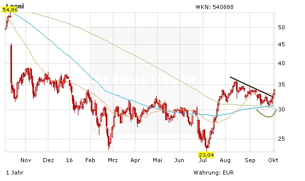 Die Aktie von Leoni hat exakt nach der Konsolidierung bis auf die 200-Tage-Linie wieder nach oben gedreht. Die Korrektur der letzten Aufwärtsbewegung von 25 Euro auf 36 Euro sollte damit beendet sein.