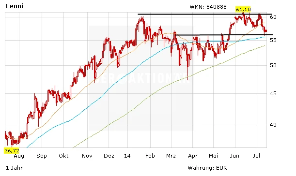 Für Leoni-Aktionäre war in den letzten Wochen ein gutes Nervenkostüm von Vorteil. Nach dem ersten Anlauf auf die 60-Euro-Marke Mitte Januar nämlich fiel die Aktie im Zuge einer scharfen Korrektur bis Ende Mai auf knapp 49 Euro zurück. Dabei hatte sich fundamental an der guten Ausgangslage von Leoni nichts geändert. Leoni baut Bordnetze, also quasi das Nervensystem eines jeden Autos. Rund drei Kilometer Kabel werden in jedem Fahrzeug verbaut. Hinzu kommt: Neue Trends wie autonomes Fahren oder mehr Sicherheit im Auto werden neben Continetal auch Leoni eine Sonderkonjunktur beschweren.