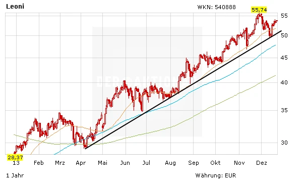 Die Jahresendrallye läuft. Nach der letzten Korrektur bis knapp unter die Marke von 50,00 Euro hat die Leoni-Aktie wieder Momentum aufgenommen. Seitdem läuft der nächste Aufwärtsimpuls, der das Papier über das letzte Hoch bei 55,74 Euro führen sollte.
