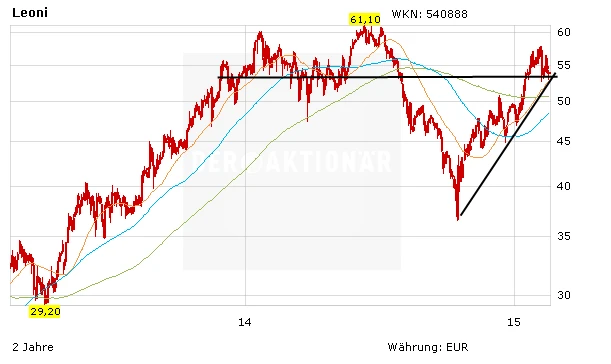 Nach dem letzten Rücksetzer bietet die Leoni-Aktie wieder gute Einstiegschancen. Unterstützung bekommt das Papier durch den kurzfristigen Aufwärtstrend. Auch die 38-Tage-Linie befindet sich auf diesem Niveau. Die Aussichten bleiben gut. Leoni profitiert als Bordnetzhersteller von der starken Nachfrage im Autosektor. 2016 erwartet der Vorstand einen Umsatz von knapp 5 Milliarden Euro. Die Aktie wird ihre Erholungsbewegung fortsetzen und bleibt bei Kursen um 54 Euro ein Kauf.