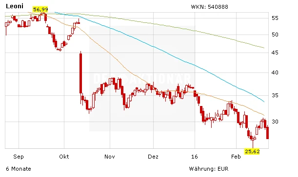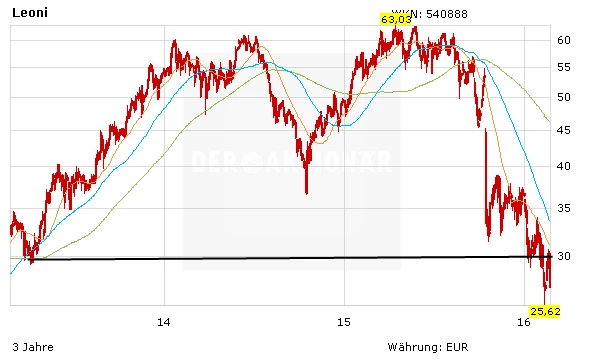 Erneut schlechte News von Leoni. Einmal mehr werden die Aktionäre enttäuscht. Die Aktie versuchte zuletzt um die 30 Euro einen Boden auszubilden. Daran ist der Wert zultezt allerdings auch gescheitert. Wichtig ist nun, dass der Support bei 25 Euro hält. Aufgrund der schlechten Prognose sieht DER AKTIONÄR keinen Anlass für eine Investition in die Aktie.