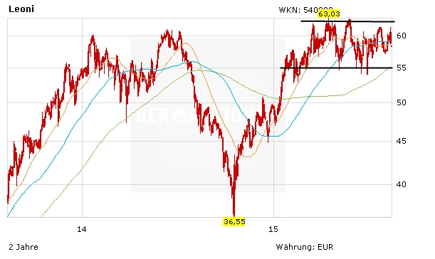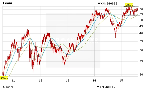 Fakt ist: China wackelt. Dennoch hält Vorstand Dieter Bellé an den selbst gesteckten Ziele für Umsatz und Ebit fest. Nach den Werksferien in der Automobilindustrie erwartet der Konzern vor allem in der Sparte Wiring Systems für Bordnetze und Kabelbäume ein noch deutlicheres Ergebniswachstum. Leoni legt seine Hoffnung dabei vor allem ins Schlussquartal. Die Aktie hat Potenzial. Wer investiert ist bleibt dabei. Neueinsteiger warten den Break der oberen Begrenzung des Seitwärtstrendkanals bei 63,03 Euro ab.