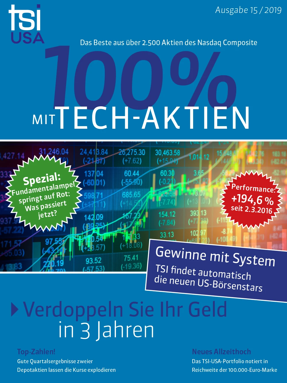 Die trendstärksten Aktien der Welt in einem Depot – das ist TSI USA. Dank der Megatrends bei Enphase Energy & Co. erklimmt das Depot neue Höhen. Top-Thema der Ausgabe: Bei welchen Überfliegern jetzt Gewinne mitgenommen werden sollten. Ziel bleibt die Depotverdopplung in jeweils drei Jahren. Letztmals als Einzelreport erhältlich. Die Einsteiger-Aktion läuft nur noch bis zum 15. August 2019.