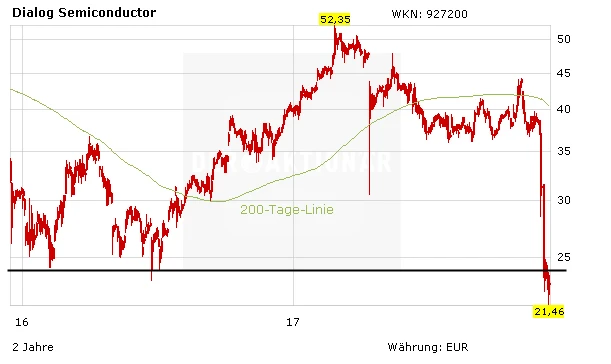 Gestern pfui – heute hui. Bis auf 21,46 Euro stürzte die Aktie von Dialog Semiconductor am Montag ab – der tiefste Stand seit Herbst 2014. Binnen vier Wochen hat sich der TecDAX-Wert damit halbiert. Den Gerüchten, dass Apple künftig keine oder weniger Komponenten für das iPhone X ordern könnte, folgten Abstufungen von Analysehäusern. Außerdem sind große Leerverkäufer engagiert.