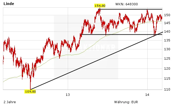 Aus charttechnischer Sicht läuft die Aktie seit gut einem Jahr in ihrer Range zwischen 138 Euro und 154 Euro. Zuletzt hat die 200-Tage-Line als eine wichtige Unterstützung gedient. Wirft man den Blick weiter in die Vergangenheit, zeigt sich das der langfristige Aufwärtstrend nach wie vor intakt ist. Gelingt der Ausbruch aus der Range, dürfte die Linde-Aktie wieder neue Hochpunkte markieren.