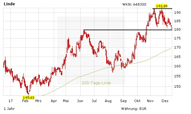 Linde ist ein Qualitätsunternehmen mit einem sicheren und starken Geschäft. Hinzu kommt die Chance auf starkes Wachstum im zukunftsträchtigen Bereich Wasserstoff. Durch die anstehende Fusion mit dem margenstarken Wettbewerber Praxair wird viel Potenzial freigesetzt. Konservative Anleger setzen mit den Umtauschaktien mit der WKN A2E4L7 auf die neue Linde. Der Stoppkurs liegt bei 160 Euro.