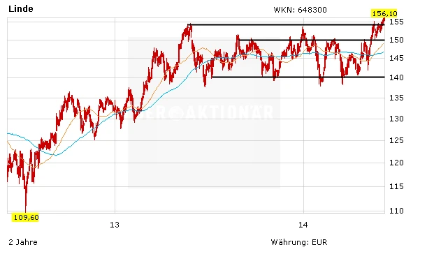 Für das erste Quartal hatte Linde aufgrund von Währungseffekten noch durchwachsene Zahlen vorgelegt. Im Gesamtjahr will Linde jedoch mit 6,5 Prozent wachsen und den operativen Gewinn um 3,5 bis 5,5 Prozent steigern. Und es geht weiter. Analysten erwarten im Schnitt bis 2017 eine Steigerung des Gewinns je Aktie gegenüber 2013 um 60 Prozent auf rund elf Euro.