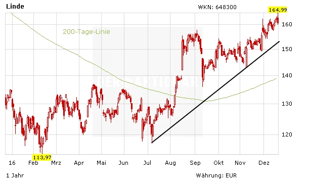 Nach Bekanntwerden des Deals hat die Linde-Aktie zunächst ein neues Jahreshoch erklommen, ehe der Titel an das Ende des DAX durchgereicht wurde. Es bleibt nun abzuwarten, wie die Behörden auf die Fusion reagieren. Mutige Anleger können auf weitere Kursgewinne spekulieren und an Bord bleiben. Die Position sollte mit einem engen Stopp bei 155 Euro abgesichert werden.
