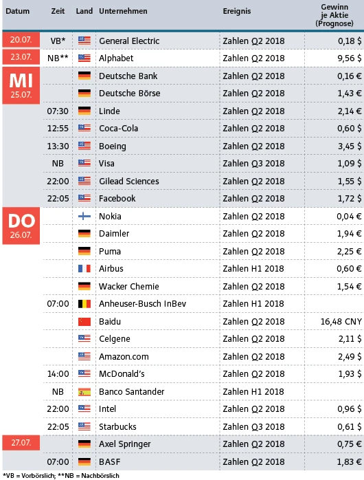 Die Berichtssaison läuft wieder auf Hochtouren. Sowohl die Tech-Riesen in den USA als auch mehrere DAX-Konzerne veröffentlichen in der kommenden Woche ihre Quartalszahlen. Bei Linde wird es zudem spannend, ob es neue Aussagen zur Fusion mit Praxair gibt.