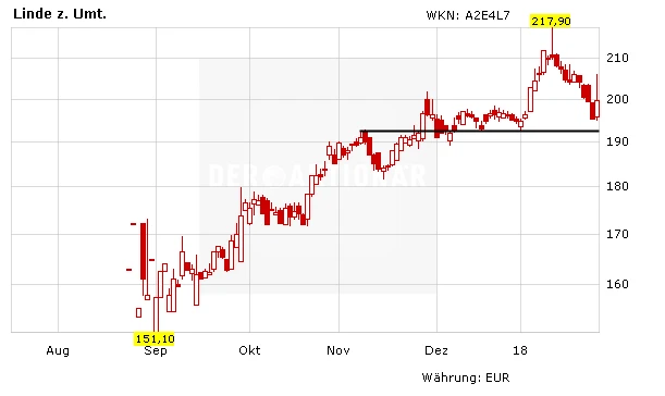 Die Linde-Aktie bleibt attraktiv. Durch die Fusion mit dem margenstarken Wettbewerber Praxair wird neues Potenzial freigesetzt. Das Geschäft mit Industriegasen brummt, zudem ist der Konzern im potenziellen Megatrend Wasserstoffmobilität glänzend positioniert. Anleger setzen mit den Umtauschaktien mit der WKN A2E4L7 auf die neue Linde. Der Stoppkurs liegt bei 160 Euro.