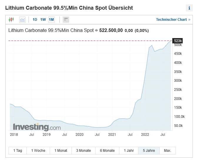 Folge: Dieser (anhaltende) Nachfrageboom hat den Preis für chinesisches Lithiumcarbonat in Batteriequalität jüngst auf einen Wert von 532.000 chinesische Yuan (ungefähr 118.000 Dollar) pro Tonne geschoben.