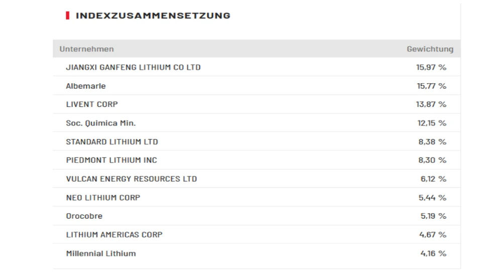 Die weltweit stark steigende Absatz von Elektrofahrzeugen dürfte in den nächsten Jahren anhalten. Das führt zwangsweise auch zu einer anziehenden Nachfrage nach Lithium. Davon sollten auch die elf Unternehmen im Best of Lithium Index profitieren. Mit dem Index-Zertifikat (WKN: DA0AAS) können Anleger 1:1 an der Entwicklung des Index teilhaben.
