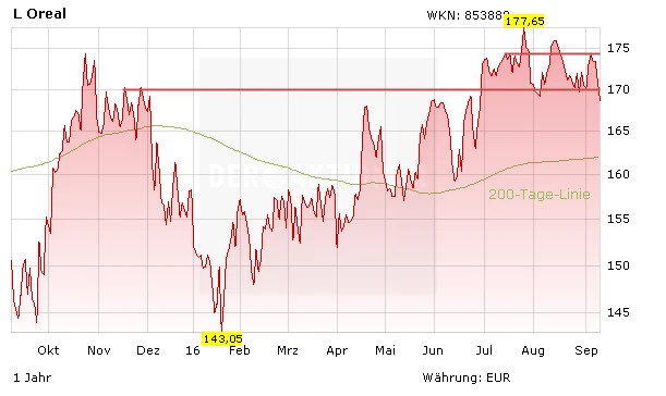Die Aktien L'Oréal notierten zwar am Freitag knapp ein Prozent im Minus, der langfristige Aufwärtstrend ist allerdings immer noch intakt. Bei einem Ausbruch über den Widerstand bei 174,50 Euro ist der Weg frei zum Allzeithoch bei 177,90 Euro. Auch Dividendenjäger haben – nicht nur im September – Spaß mit dem Titel. Den Aktionären winken 3,30 Euro Dividende je Aktie.