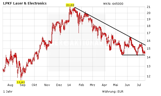 Die zunehmende Miniaturisierung und immer kürzere Produktzyklen spielen LPKF in die Karten. Der Konzern sollte das Wachstum fortsetzen und die gesteckten Ziele erreichen. Durch die Korrektur ist die Aktie nicht mehr so ambitioniert bewertet wie zu Hochzeiten. Das 2015er-KGV liegt nun bei 16, was angesichts der Wachstumsaussichten Luft nach oben lässt. Die Aktie ist dabei, im Bereich um 14,25 Euro einen Boden auszubilden. Allein das Wiedererreichen des Jahreshochs bietet ein Potenzial von 45 Prozent. Risikobewusste Anleger nutzen das aktuelle Niveau, für den Aufbau einer ersten Position.