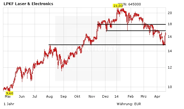 Durch den Abpraller an der horizontalen Unterstützung bei 14,90 Euro wurde der weitere Absturz abgewendet. Gelingt nun auch noch der Sprung über die 17-Euro-Marke, hellt sich die charttechnische Situation der LPKF-Aktie weiter auf. Der nächste Widerstand wartet dann erst im Bereich der 18 Euro. Neben dem charttechnischen Impuls ist die Aktie auch aus Bewertungsgründen wieder attraktiver. Durch die Korrektur ist das KGV deutlich niedriger als Anfang des Jahres und lässt angesichts der Wachstumsaussichten mit einem 2015er-Wert von 16 noch Luft nach oben.