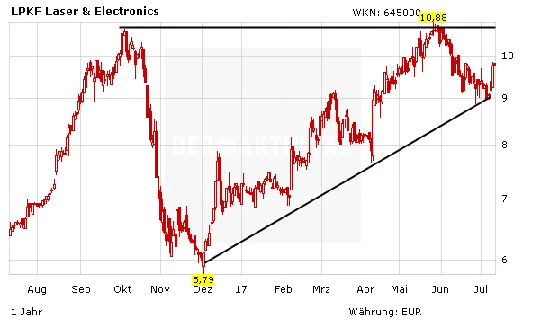 Der aufwärtstrend ist intakt. Risikobewusste Anleger können auf dem aktuellen Niveau eine erste Position aufbauen und danach die nächsten Stimmrechtsmitteilungen im Auge behalten. Ein Stopp bei 8,75 Euro sichtert die Position eng ab.