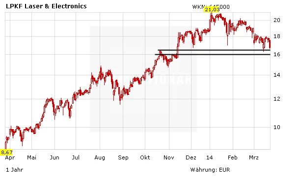 Die Commerzbank hat die Einstufung für die LPKF-Aktie nach den Zahlen auf „Hold“ mit einem Kursziel 18,00 Euro bestätigt. Charttechnisch hat sich die Situation durch den Kursrutsch unter die 17-Euro-Marke eingetrübt. Die nächste horizontale Unterstützung verläuft im bereich der 16,00 Euro. Dort sollte spätestens der Verkaufsdruck nachlassen. Investierte Anleger bleiben vorerst dabei.